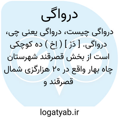 درواگی. [ دَرْ ] ( اِخ ) ده کوچکی است از بخش قصرقند شهرستان چاه بهار واقع در 20 هزارگزی شمال قصرقند و کنار راه مالرو قصرقند به چانف. ( از فرهنگ جغرافیایی ایران ج 8 ).