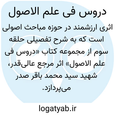 [ویکی نور] دروس فی علم الاصول (شرح الحلقه الثالثه). «دروس فی علم الاصول(شرح الحلقة الثالثة)، اثر ناجی طالب آل فقیه عاملی است که به شرح حلقه سوم از کتاب«دروس فی علم الاصول» شهید محمد باقر صدر پرداخته و به زبان عربی آن را نگاشته است.
