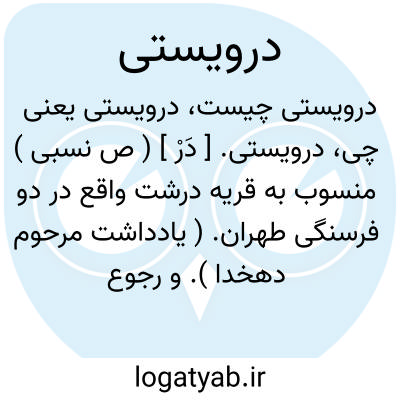 لغت نامه دهخدا درویستی. [ دَرْ ] ( ص نسبی ) منسوب به قریه درشت واقع در دو فرسنگی طهران. ( یادداشت مرحوم دهخدا ). و رجوع به درشت شود.