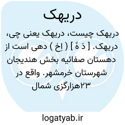 دریهک. [ دَ هََ ] ( اِخ ) دهی است از دهستان صفائیه بخش هندیجان شهرستان خرمشهر. واقع در 23هزارگزی شمال هندیحان و 8 هزارگزی جنوب راه اتومبیل رو ده ملا به بندر دیلم، با 450 تن سکنه. آب آن از رودخانه زهره راه آن در تابستان اتومبیل رو است. ساکنین آن از طایفه افشار هستند. ( از فرهنگ جغرافیایی ایران ج 6 ).