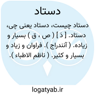 لغت نامه دهخدا دستاد. [ دَ ] ( ص، ق ) بسیار و زیاده. ( آنندراج ). فراوان و زیاد و بسیار و کثیر. ( ناظم الاطباء ).