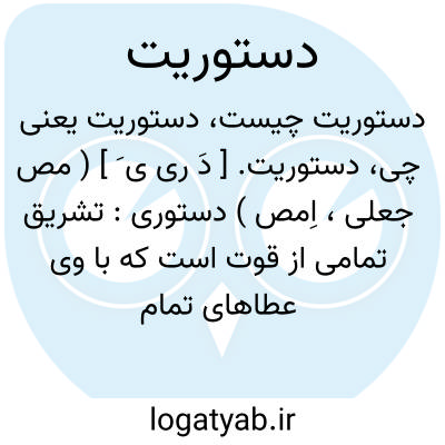 دستوریت. [ دَ ری ی َ ] ( مص جعلی، اِمص ) دستوری: تشریق تمامی از قوت است که با وی عطاهای تمام تواند دادن، و پارسیان او را دستوریت خوانند و دستور وزیر بود و هرچ خواهد کردن بکند از نیکوی، و این نام دستوری نیز برراست بودن از آفتاب فکند. ( التفهیم بیرونی ص 467 ).