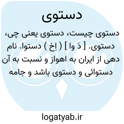 دستوی. [ دَ وا ] ( اِخ ) دستوا. نام دهی از ایران به اهواز و نسبت به آن دستوائی و دستوی باشد و جامه های دستوائی معروف بوده است. ( یادداشت مرحوم دهخدا ).