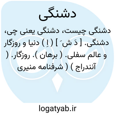 دشنگی. [ دَ ش َ ] ( اِ ) دنیا و روزگار و عالم سفلی. ( برهان ). روزگار. ( آنندراج ) ( شرفنامه منیری ):