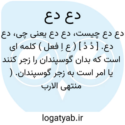 دع دع. [ دُ دُ ] ( ع اِ فعل ) کلمه ای است که بدان گوسپندان را زجر کنند یا امر است به زجر گوسپندان. ( منتهی الارب ).امر است به صدا زدن گوسفندان. ( از اقرب الموارد ).، دعدع. [ دَ دَ ] ( ع ص، اِ ) زمین بی نبات. ( منتهی الارب ) ( از اقرب الموارد ).