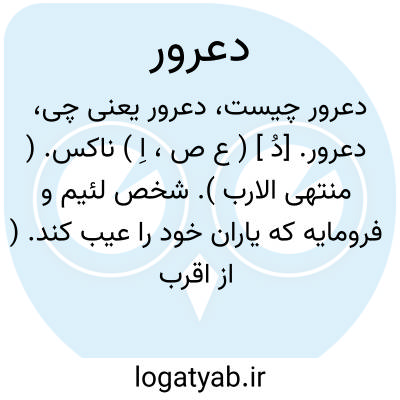 لغت نامه دهخدا دعرور. [دُ ] ( ع ص، اِ ) ناکس. ( منتهی الارب ). شخص لئیم و فرومایه که یاران خود را عیب کند. ( از اقرب الموارد ).