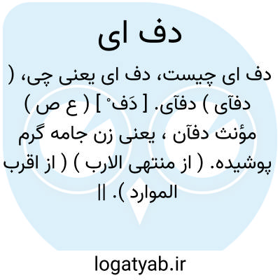 ( دفآی ) دفآی. [ دَف ْ ] ( ع ص ) مؤنث دفآن، یعنی زن جامه گرم پوشیده. ( از منتهی الارب ) ( از اقرب الموارد ). || زن خیمه نشین. ( منتهی الارب ) ( آنندراج ). || مؤنث أدفاء است یعنی زنی که کاهلش بر سینه اش مشرف و خمیده باشد. ( از اقرب الموارد ). زن کوژپشت. ( ناظم الاطباء ).