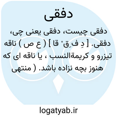 دفقی. [ دِ ف ِق ْ قا ] ( ع ص ) ناقه تیزرو و کریمةالنسب، یا ناقه ای که هنوز بچه نزاده باشد. ( منتهی الارب ) ( از اقرب الموارد ). || اسپ ماده نیکورفتار شتاب رو. ( منتهی الارب ). || ( اِ ) نوعی مشی و راه رفتن که در آن شتاب است. ( از اقرب الموارد ): مشی الدفقی؛ شتاب رفتن، یا گاهی بر این پهلو و گاهی بر آن پهلو یا گشاده گام رفتن. ( از منتهی الارب ).