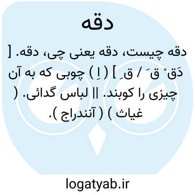 لغت نامه دهخدا دقه. [ دَق ْ ق َ / ق ِ ] ( اِ ) چوبی که به آن چیزی را کوبند. || لباس گدائی. ( غیاث ) ( آنندراج ).
