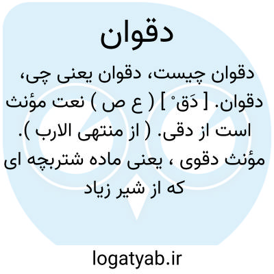 دقوان. [ دَق ْ ] ( ع ص ) نعت مؤنث است از دقی. ( از منتهی الارب ). مؤنث دقوی، یعنی ماده شتربچه ای که از شیر زیاد خوردن، شیر ناگوارد شده باشد مر او را. ( ناظم الاطباء ). شتربچه ای که شیر بسیار خورده باشد در نتیجه شکم وی فاسد شده بکار افتاده باشد. ( از اقرب الموارد ). دقی. و رجوع به دَقّی شود.