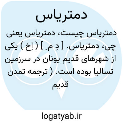 لغت نامه دهخدا دمتریاس. [ دِ م ِ ] ( اِخ ) یکی از شهرهای قدیم یونان در سرزمین تسالیا بوده است. ( ترجمه تمدن قدیم فوستل دو کولانژ ).