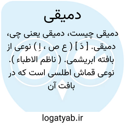 دمیقی. [ دَ ] ( ع ص، اِ ) نوعی از بافته ابریشمی. ( ناظم الاطباء ). نوعی قماش اطلسی است که در بافت آن رشته های زرو سیم بکار می رود. ( از فرهنگ شعوری ج 1 ورق 444 ).