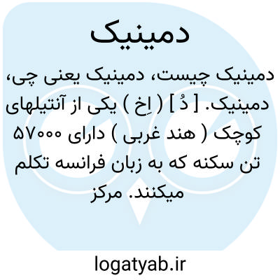 دمینیک. [ دُ ] ( اِخ ) یکی از آنتیلهای کوچک ( هند غربی ) دارای 57000 تن سکنه که به زبان فرانسه تکلم میکنند. مرکز آن رزو با 12000 تن سکنه است. محصولات منطقه حاره را دارد.