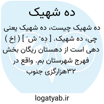 ده شهیک. [ دِه ْ ش َ ] ( اِخ ) دهی است از دهستان ریگان بخش فهرج شهرستان بم. واقع در 32هزارگزی جنوب خاوری فهرج.سکنه آن 180 تن. ( از فرهنگ جغرافیایی ایران ج 8 ).