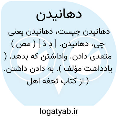 دهانیدن. [ دِ دَ ] ( مص ) متعدی دادن. واداشتن که بدهد. ( یادداشت مؤلف ). به دادن داشتن. ( از کتاب تحفه اهل بخارا ): اخطره اﷲ؛ یاد دهانید خدا او را بعد فراموشی. ( منتهی الارب ). بخشیدن کنانیدن و عطاکردن فرمودن. ( ناظم الاطباء ). و رجوع به دادن شود.