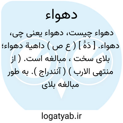 دهواء. [ دَهَْ ] ( ع ص ) داهیة دهواء؛ بلای سخت، مبالغه است. ( از منتهی الارب ) ( آنندراج ). به طور مبالغه بلای سخت را گویند. ( ناظم الاطباء ).