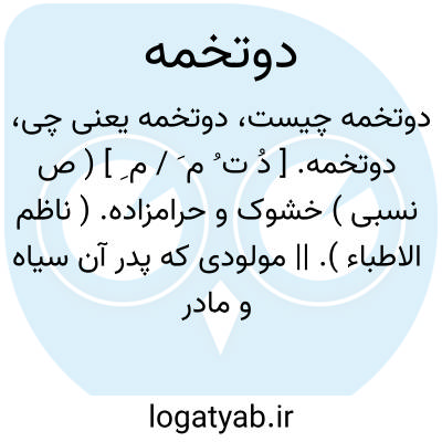 دوتخمه. [ دُ ت ُ م َ / م ِ ] ( ص نسبی ) خشوک و حرامزاده. ( ناظم الاطباء ). || مولودی که پدر آن سیاه و مادر آن سپید بود و بالعکس. || هر حیوان و نباتی که از دو جنس مختلف بوجود آمده باشد. ( ناظم الاطباء ). اکدش. اسب دوتخمه. دورگه. که پدر عربی و مادر ترکمانی دارد. ( یادداشت مؤلف ).