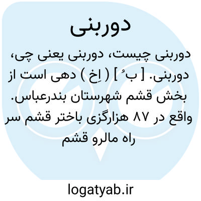دوربنی. [ ب ُ ] ( اِخ ) دهی است از بخش قشم شهرستان بندرعباس. واقع در 87 هزارگزی باختر قشم سر راه مالرو قشم به باسعید. 180 تن سکنه. آب آن از چاه و باران تأمین می شود. ( از فرهنگ جغرافیایی ایران ج 8 ).