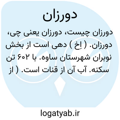 لغت نامه دهخدا دورزان. ( اِخ ) دهی است از بخش نوبران شهرستان ساوه. با 602 تن سکنه. آب آن از قنات است. ( از فرهنگ جغرافیایی ایران ج 1 ).
