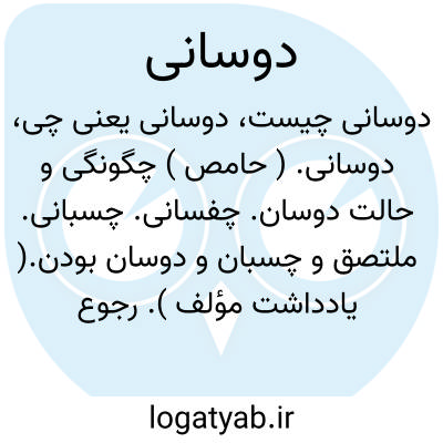دوسانی. ( حامص ) چگونگی و حالت دوسان. چفسانی. چسبانی. ملتصق و چسبان و دوسان بودن.( یادداشت مؤلف ). رجوع به دوسیدن و دوسانیدن شود.