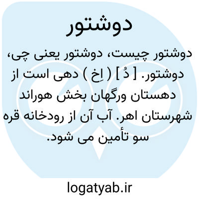 دوشتور. [ دُ ] ( اِخ ) دهی است از دهستان ورگهان بخش هوراند شهرستان اهر. آب آن از رودخانه قره سو تأمین می شود. 397 تن سکنه. صنایع دستی زنان، فرش بافی. ( از فرهنگ جغرافیایی ایران ج 4 ).