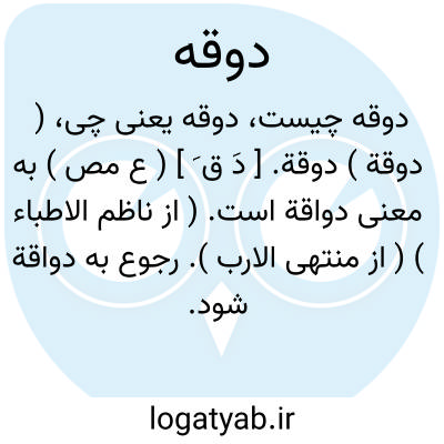 لغت نامه دهخدا ( دوقة ) دوقة. [ دَ ق َ ] ( ع مص ) به معنی دواقة است. ( از ناظم الاطباء ) ( از منتهی الارب ). رجوع به دواقة شود.دوقة. [ دَ ق َ ] ( ع اِمص ) دوقانیة. تباهی. || حماقت. ( منتهی الارب ) ( ناظم الاطباء ).دوقه. [ دَ ق َ ] ( اِخ ) کین زاده مولی عثمان بن محمد رومی. متوفا به سال 1013 هَ. ق. او راست: ازهار الجمائل فی وصف الاوائل. ( یادداشت مؤلف ).