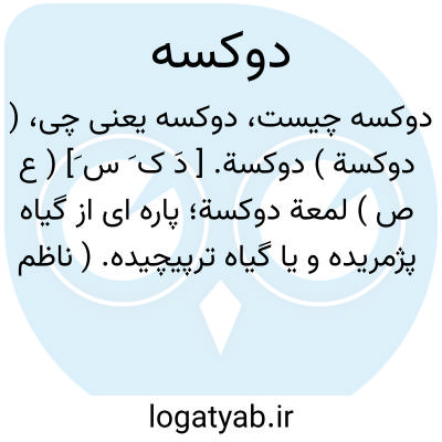( دوکسة ) دوکسة. [ دَ ک َ س َ] ( ع ص ) لمعة دوکسة؛ پاره ای از گیاه پژمریده و یا گیاه ترپیچیده. ( ناظم الاطباء ) ( از آنندراج ). به معنی لمعة دوکس است. ( منتهی الارب ). و رجوع به دوکس شود.