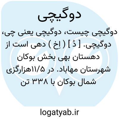 دوگیچی. [ دُ ] ( اِخ ) دهی است از دهستان بهی بخش بوکان شهرستان مهاباد. در 11/5هزارگزی شمال بوکان با 338 تن سکنه و آب آن از چشمه می باشد. ( از فرهنگ جغرافیایی ایران ج 4 ).