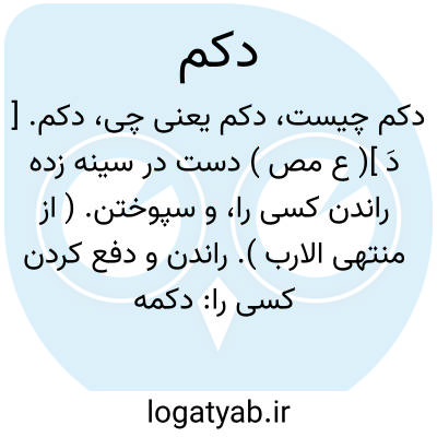 دکم. [ دَ ]( ع مص ) دست در سینه زده راندن کسی را، و سپوختن. ( از منتهی الارب ). راندن و دفع کردن کسی را: دکمه فی صدره؛ أی دفعه. ( از اقرب الموارد ). || کوفتن بعض را بر بعض. ( از منتهی الارب ) ( از اقرب الموارد ). || شکستن دهان یا بینی کسی را. || آرمیدن با زن. ( از ذیل اقرب الموارد از تاج ).