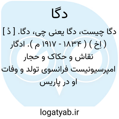 دگا. [ دُ ] ( اِخ ) ( 1834 - 1917 م ). ادگار نقاش و حکاک و حجار امپرسیونیست فرانسوی تولد و وفات او در پاریس بود. وی در فن بیان اشکال و حرکات با سادگیی نیرومند مهارتی بسزا داشت، و رسام و رنگ آمیز بزرگی بشمار میرود. دگا صورت اشخاص و صحنه های رقص و حیات روزانه را نقاشی کرده است. ( از فرهنگ فارسی معین ). و رجوع به دایرةالمعارف فارسی شود.