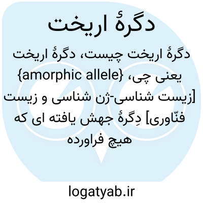 {amorphic allele} [زیست شناسی-ژن شناسی و زیست فنّاوری] دِگرۀ جهش یافته ای که هیچ فراورده ای تولید نمی کند متـ. اَریخت2 amorph2 دِگرۀ پوچ null allele