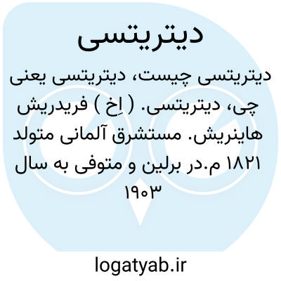دیتریتسی. ( اِخ ) فریدریش هاینریش. مستشرق آلمانی متولد 1821 م.در برلین و متوفی به سال 1903 م. که در مآخذ فارسی و عربی نام او را دیتریشی و دیتریسی ضبط کرده اند در هاله و برلین الهیات مسیحی و در هاله و لایپزیک السنه شرقی تحصیل کرد. در سال 1847 م. عازم مشرق زمین شدو بیش از یکسال در قاهره عربی آموخت سپس به مصر علیا، شبه جزیره سینا، بیت المقدس و دمشق مسافرت کرد و از طریق قسطنطنیه، آتن و تریست به آلمان بازگشت. از سال 1850م. استاد دانشگاه برلین بود. بیشتر کارهای وی در زبان و ادب عرب بود. آثار عمده اش در این زمینه متنبی و سیف الدوله ( لایپزیگ 1847 م. ) و الفیة ( متن عربی لایپزیگ 1851 م. ترجمه آلمانی، لایپزیگ 1852 م. ) است و نشر آثار متنبی با شرح واحدی ( برلین 61-1858 م. ) پس از آن به فلسفه اسلامی در قرن دهم پرداخت. حکمت مشائی اعراب ( برلین 1865 م. )، منطق و علم النفس اعراب ( لایپزیگ 1868 م. )، سیر در طبیعت و فلسفه طبیعی اعراب در قرن دهم ( لایپزیک 1876 چ 2 )، مردم شناسی اعراب در قرن دهم ( لایپزیگ 1871 م. ) فلسفه اعراب در قرن دهم ( دو جلد، لایپزیگ 1876 و 1879 م. )، در 1882 م. قطعاتی از حکمت ارسطو را که در کتب عربی محفوظ مانده بودمنتشر نمود. از آثار دیگرش لغتنامه عربی به آلمانی است. ( لایپزیگ 1881 م. ) ( از دائرة المعارف فارسی ).