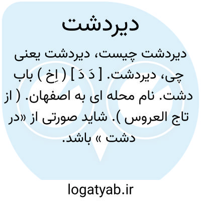 دیردشت. [ دَ دَ ] ( اِخ ) باب دشت. نام محله ای به اصفهان. ( از تاج العروس ). شاید صورتی از «در دشت » باشد.