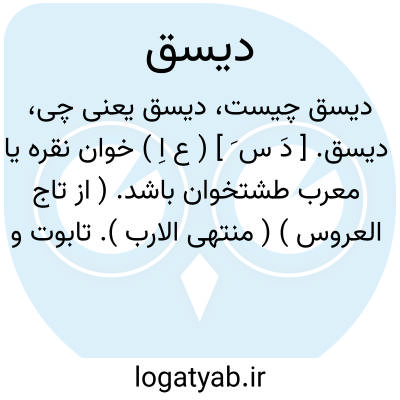 دیسق. [ دَ س َ ] ( ع اِ ) خوان نقره یا معرب طشتخوان باشد. ( از تاج العروس ) ( منتهی الارب ). تابوت و طشتخوان. ( مهذب الاسماء ). || ( ص ) راه دراز. || حوض پرآب. ( منتهی الارب ) ( از تاج العروس ). || آبگیر زلال و سپید. ( از تاج العروس ).