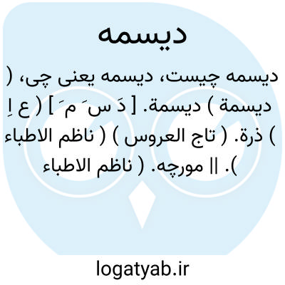 ( دیسمة ) دیسمة. [ دَ س َ م َ ] ( ع اِ ) ذرة. ( تاج العروس ) ( ناظم الاطباء ). || مورچه. ( ناظم الاطباء ). دسمة. ( منتهی الارب ).