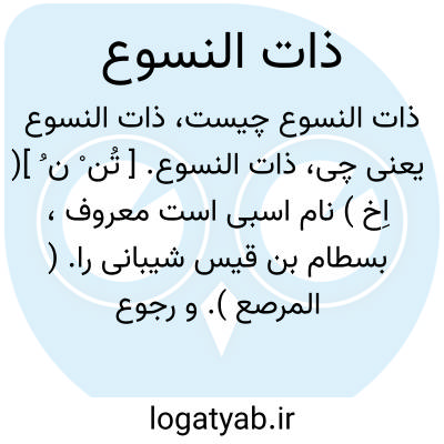 ذات النسوع. [ تُن ْ ن ُ ]( اِخ ) نام اسبی است معروف، بسطام بن قیس شیبانی را. ( المرصع ). و رجوع به عقدالفرید ج 6 ص 54 و 67 شود.
