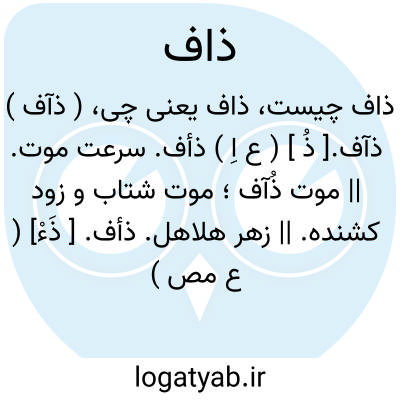 ( ذآف ) ذآف.[ ذُ ] ( ع اِ ) ذأف. سرعت موت. || موت ذُآف؛ موت شتاب و زود کشنده. || زهر هلاهل.