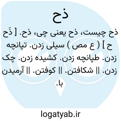 ذح. [ ذَح ح ] ( ع مص ) سیلی زدن. تپانچه زدن. طپانچه زدن. کشیده زدن. چک زدن. || شکافتن. || کوفتن. || آرمیدن با.