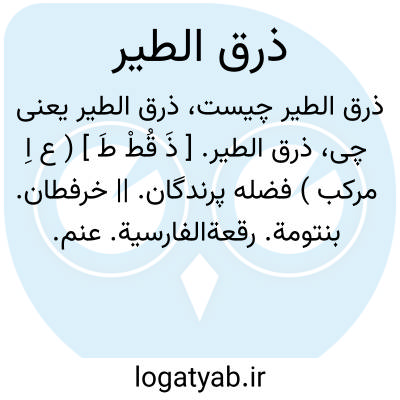 ذرق الطیر. [ ذَ قُطْ طَ ] ( ع اِ مرکب ) فضله پرندگان. || خرفطان. بنتومة. رقعةالفارسیة. عنم. داود ضریر انطاکی در تذکره گوید: ذرق، یطلق علی روث الطیور و کل مع اصله. و اذا قید بذرق الطیور فالبنتومة. و ابن البیطار در مفردات آرد: هو النبات المعروف بالیونانیة بالبنتومة.
