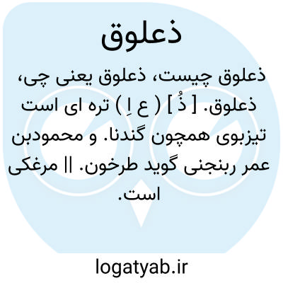 ذعلوق. [ ذُ ] ( ع اِ ) تره ای است تیزبوی همچون گندنا. و محمودبن عمر ربنجنی گوید طرخون. || مرغکی است. || نوعی از سماروغ. یعنی قسمی از کماة. || ( ص ) کودک چالاک تیزفهم سبک روح. || ( صوت ) ذعلوق دهلوق، کلمه ای است که میش را به دوشیدن خوانند. || گوسفند سبک جثه تنگ دهان ( ؟ ). || ( اِخ ) نام شمشیر خالدبن سعیدبن عاص.