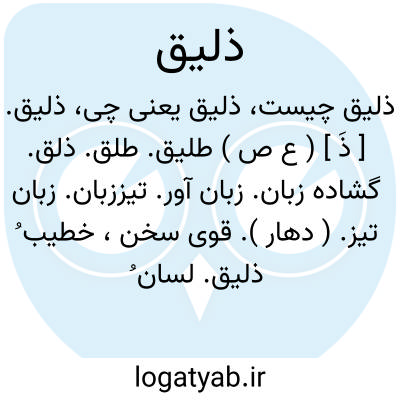 ذلیق. [ ذَ ] ( ع ص ) طلیق. طلق. ذلق. گشاده زبان. زبان آور. تیززبان. زبان تیز. ( دهار ). قوی سخن، خطیب ُ ذلیق. لسان ُ ذلیق. || سنان ذلیق؛ نیزه تیز.