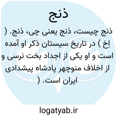لغت نامه دهخدا ذنج. ( اِخ ) در تاریخ سیستان ذکر او آمده است و او یکی از اجداد بخت نرسی و از اخلاف منوچهر پادشاه پیشدادی ایران است. ( تاریخ سیستان ص 34 ).