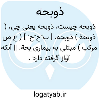 ( ذوبحة ) ذوبحة. [ ب َح ْح َ ] ( ع ص مرکب ) مبتلی به بیماری بحة. || آنکه آواز گرفته دارد.
