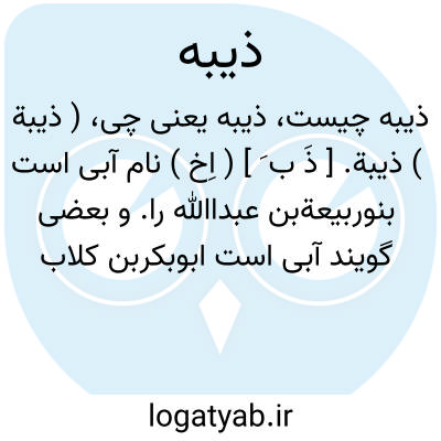( ذیبة ) ذیبة. [ ذَ ب َ ] ( اِخ ) نام آبی است بنوربیعةبن عبداﷲ را. و بعضی گویند آبی است ابوبکربن کلاب را و بدانجا رمله ای که بنوربیة بدانجا فرود آیند.