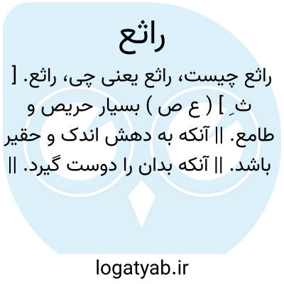 راثع. [ ث ِ ] ( ع ص ) بسیار حریص و طامع. || آنکه به دهش اندک و حقیر باشد. || آنکه بدان را دوست گیرد. || آنکه در وی دنائت و فرومایگی و خساست باشد و در چیزهابحرص و آز تمام نظر کند. ( منتهی الارب ) ( آنندراج ).