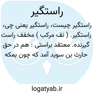 راستگیر. ( نف مرکب ) مخفف راست گیرنده. معتقد براستی: هم در حق حارث بن سوید آمد که چون بمکه رفت و از مدینه بگریخت پشیمان شد بر آن، کس فرستاد بقوم خود گفت بپرسید از رسول علیه السلام که تا خود مرا توبه باشد که من پشیمانم. خدای تعالی این آیه فرستاد که: «... اِلاَ الذین َ تابُوامِن ْ بَعدِ ذلک وَ اصلحوا فَاِن َّ اﷲ غفور رَحیم ». کسی از جمله خویشان او آیة آنجا فرستاد تا بر او خوانند. حارث او را گفت تو به این که میگویی راست گیری و رسول از تو راست گیرتر است و خدای تعالی از هر دو راستگیرتر است تا بمدینه آمد و اسلام آورد... ( تفسیر ابوالفتوح رازی ج 1 ص 600 ).