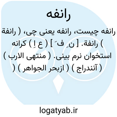 ( رانفة ) رانفة. [ ن ِ ف َ ] ( ع اِ ) کرانه استخوان نرم بینی. ( منتهی الارب ) ( آنندراج ) ( ازبحر الجواهر ) ( ناظم الاطباء ). || گوشت بن کف دست. ( از اقرب الموارد ) ( منتهی الارب ) ( آنندراج ) ( از بحر الجواهر ) ( از ناظم الاطباء ). || پوست پاره طرف بینی. ( منتهی الارب ) ( آنندراج ) ( از بحر الجواهر ). || کرانه غضروف گوش. ( بحر الجواهر ) ( از اقرب الموارد ). || طرف باریک از جگر. ( از اقرب الموارد ) ( منتهی الارب ) ( از بحر الجواهر ). || کرانه آستین. ( منتهی الارب ) ( از اقرب الموارد ) ( ناظم الاطباء ). || فرود سرین مردم وقت قیام وی یا عام است. ( منتهی الارب ) ( آنندراج ) ( ناظم الاطباء ). || فرود دنبه. ( منتهی الارب ) ( آنندراج ) ( ناظم الاطباء ). پایین الیه که هنگام نشستن بسوی زمین است. ( از اقرب الموارد ) ( از مهذب الاسماء ) ( از بحر الجواهر ). || قسمت بالای دنبه. ( از بحر الجواهر ). || گلیم که بر شکاف خانه های اعراب تا زمین آویزند. ج، رَوانِف. ( منتهی الارب ) ( آنندراج ) ( ناظم الاطباء ) ( از اقرب الموارد ).
