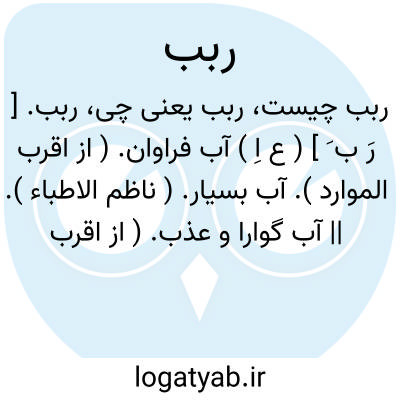 ربب. [ رَ ب َ ] ( ع اِ ) آب فراوان. ( از اقرب الموارد ). آب بسیار. ( ناظم الاطباء ). || آب گوارا و عذب. ( از اقرب الموارد ). آب بسیار خوش. ( منتهی الارب ). آب گوارا. ( ناظم الاطباء ). || ج ِ رِبة. ( ناظم الاطباء ). رجوع به ربة شود. || ج ِ رُبة. ( ناظم الاطباء ). رجوع به ربة شود.