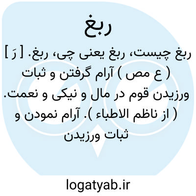 ربغ. [ رَ ] ( ع مص ) آرام گرفتن و ثبات ورزیدن قوم در مال و نیکی و نعمت. ( از ناظم الاطباء ). آرام نمودن و ثبات ورزیدن در مال و نیکی و نعمت. ( آنندراج ) ( منتهی الارب ). || اقامت کردن. ( اقرب الموارد ).