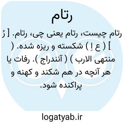 رتام. [ رُ ] ( ع اِ ) شکسته و ریزه شده. ( منتهی الارب ) ( آنندراج ). رفات یا هر آنچه در هم شکند و کهنه و پراکنده شود. ( از اقرب الموارد ).